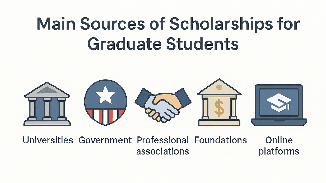 Main sources for grad scholarships include universities, government, professional associations, foundations, and online platforms.
